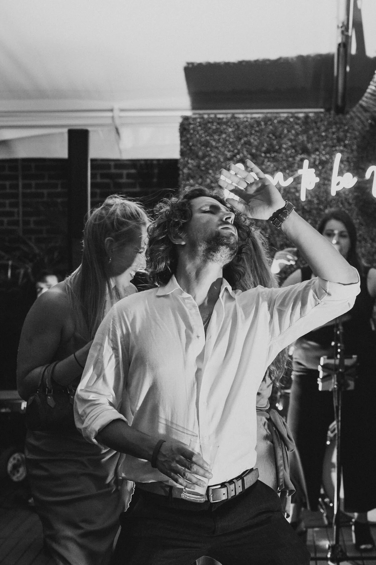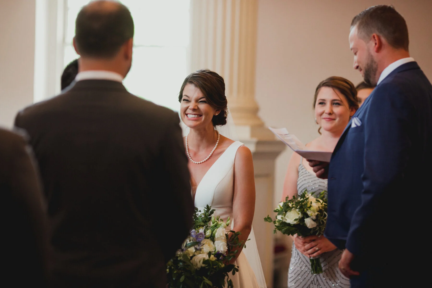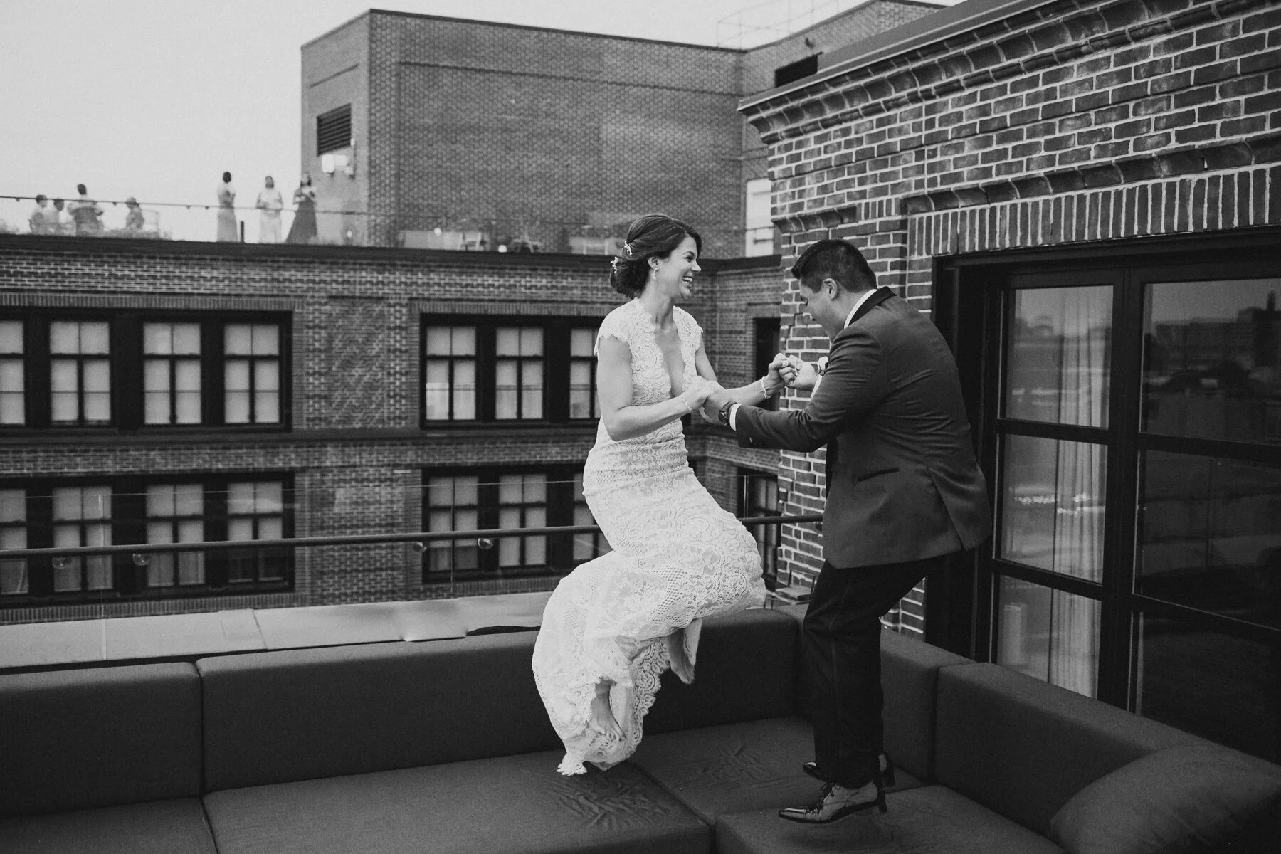 If you want an example of how to gracefully handle several wedding reschedules during a pandemic, look no further than Julia and Randy. Their #1 goal through the entire process was to get married, whatever that was going to look like, and they calmly navigated whatever was thrown at them. When August 21st dawned with perfect weather, all their original vendors in place, and the most beautiful rooftop wedding lounge created in collaboration with Lily and Grayson Events, as their friend, photographer, and cheerleader, I couldn’t have been happier for them. It seemed like the entire city was cheering them on when cars honked and pedestrians yelled “congratulations” and “oh you look so good!” as they walked back to the Line Hotel from All Souls Unitarian Church, where they were married. Guests safely celebrated via their own pod lounges and played games on the roof during cocktail hour as Julia and Randy’s dog, Wilson, walked around to beg for appetizers from guests.