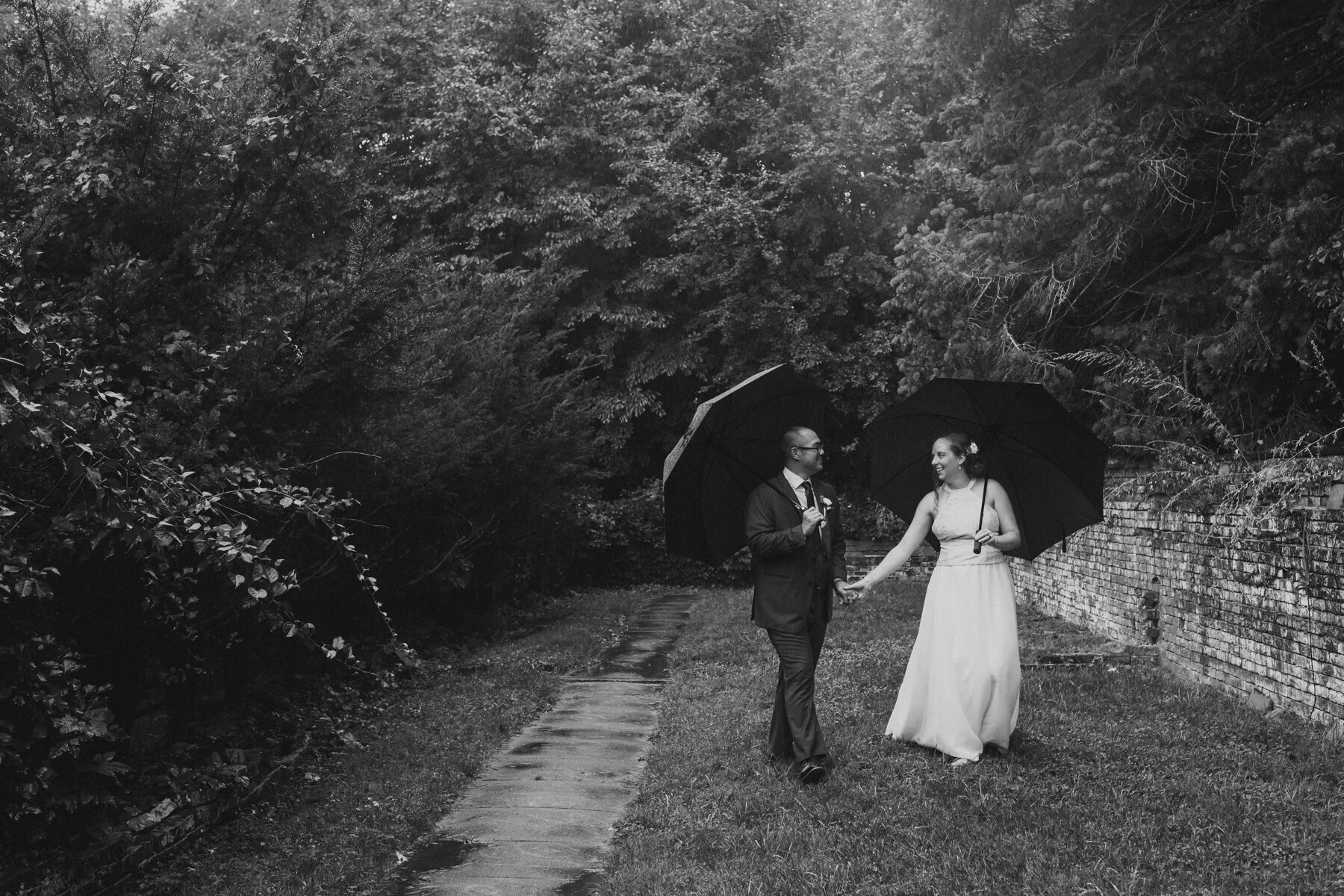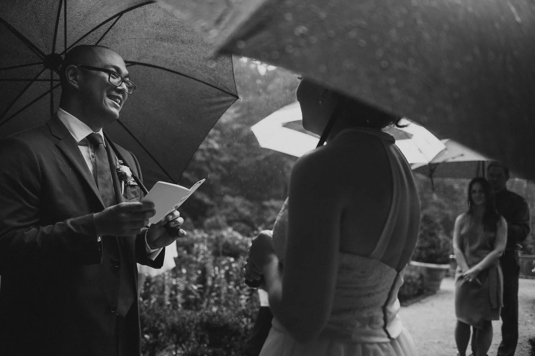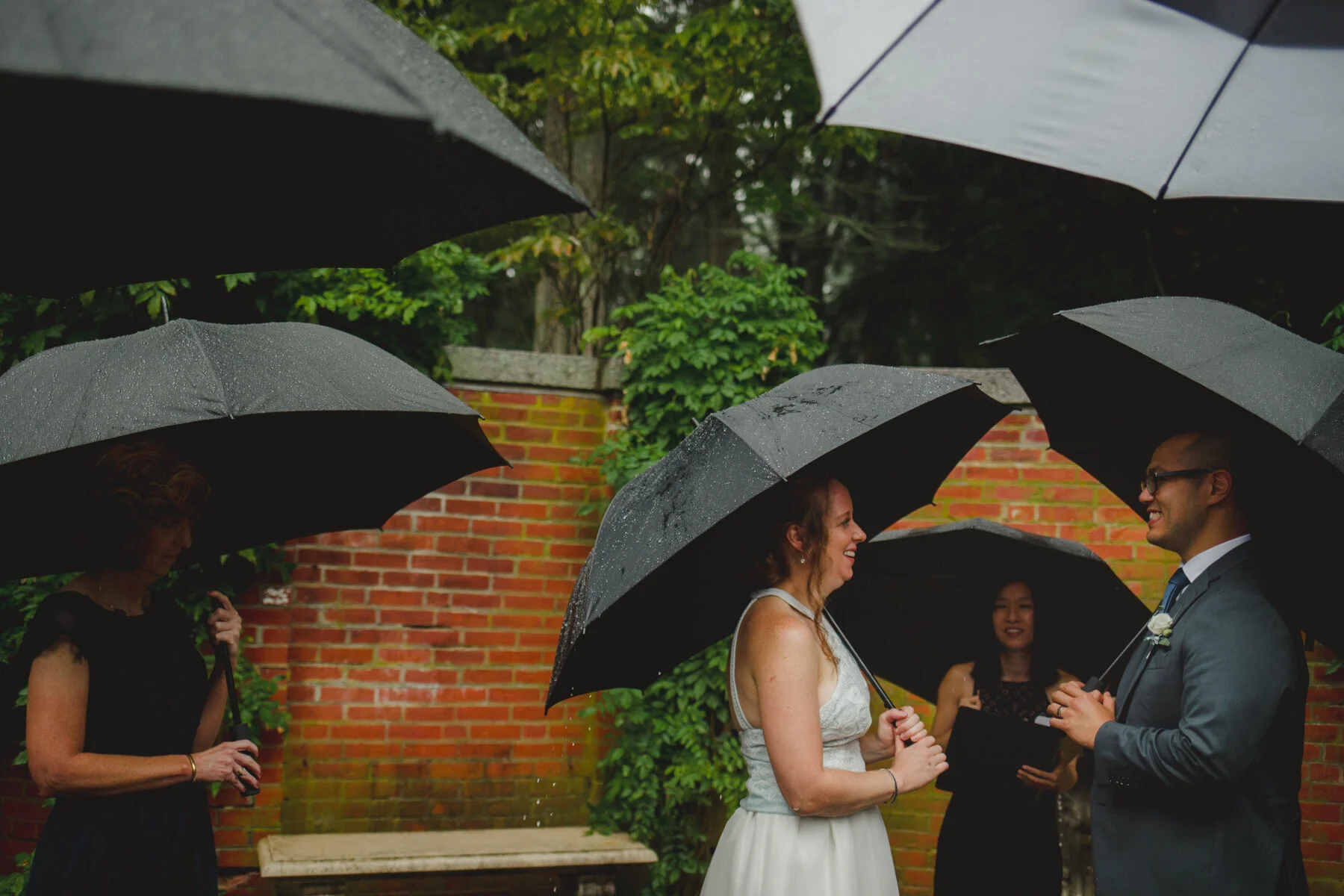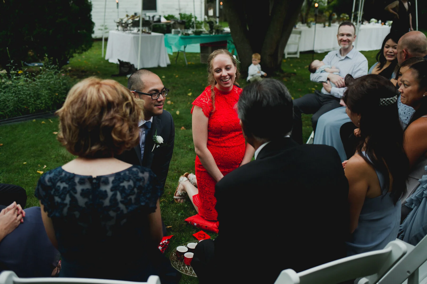Next, Ryan would talk about the rain. The unrelenting rain, which only picked up more during their ceremony, in a hidden rose garden in the middle of the forest at Maudsley State park, where their families gathered around them, leaning forward to hear the vows spoken amidst the downpour. When Ryan began to read his vows, the rain soaked the papers he had written them on, sending rivulets of ink flowing onto the stonework and the puddles. He had to wing the last few sentences, but Erin already knew his unending devotion and love towards her, no fancy words needed. Finally, they’d tell their grandkids about the great pandemic of 2020, and how it put their original summer camp wedding plans on hold until the next summer, but they still wanted to get married on August 29th. And so, epic falls, Covid 19, and storms be damned, they forged ahead, and what a wonderful day it was! Every family member was present, and so happy to be there. The little kids didn’t whine or complain about the rain- in fact, nobody did at all. The rain cleared up after the ceremony in time for dinner at Ryan’s parents house, and it was an indulgent one, with lobster tails, and steak tips and very good Mac and cheese. A big group of their friends surprised them at the house for a socially-distant parade with signs! And to cap it all off, Erin and Ryan served their families tea in the most beautiful tea ceremony.