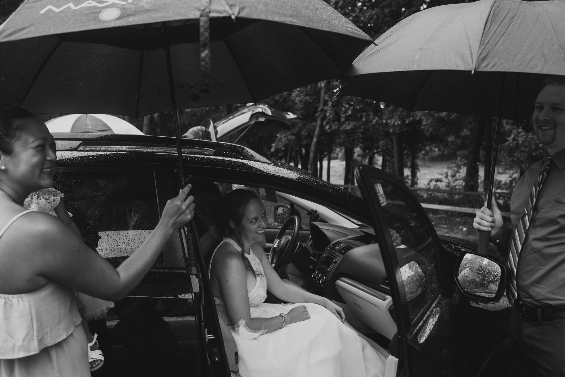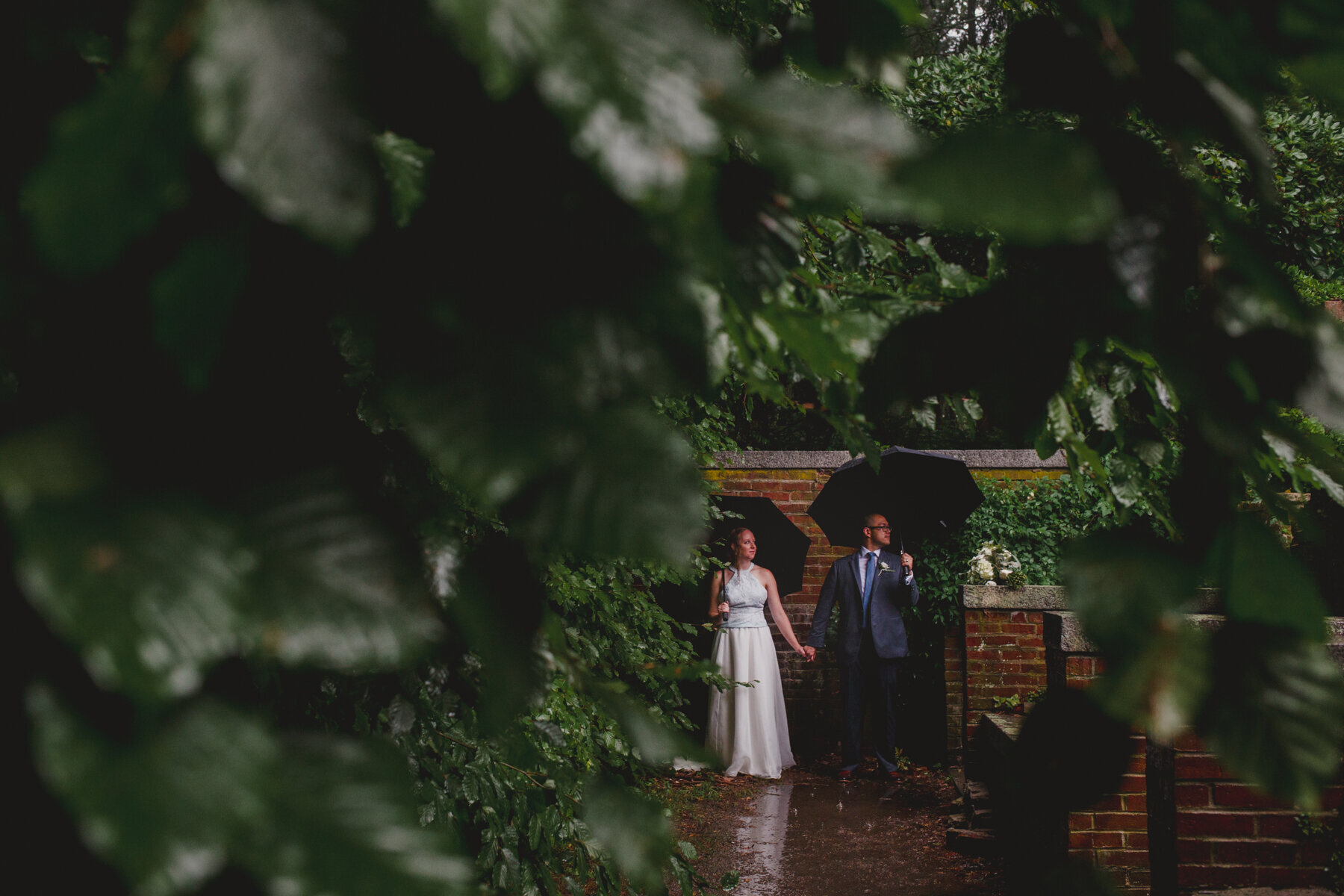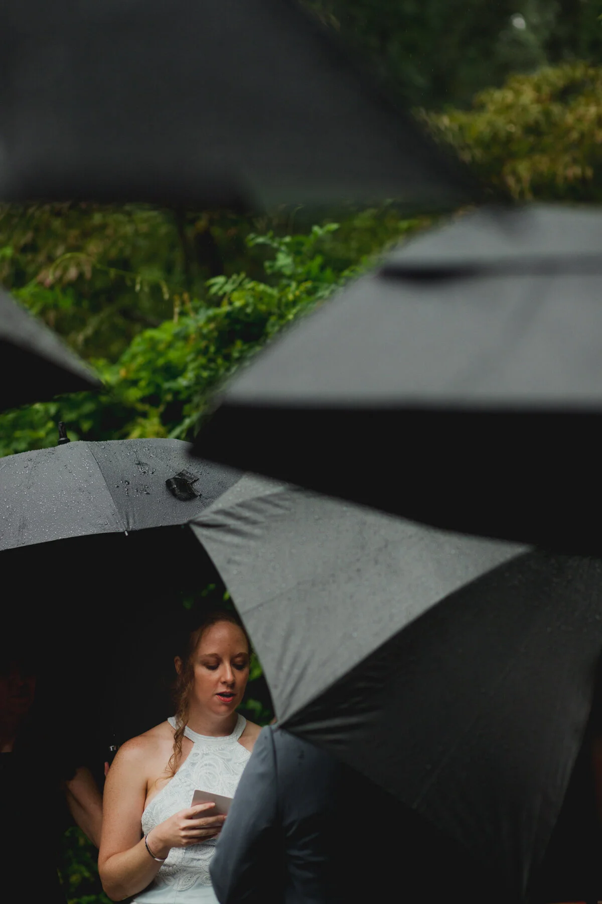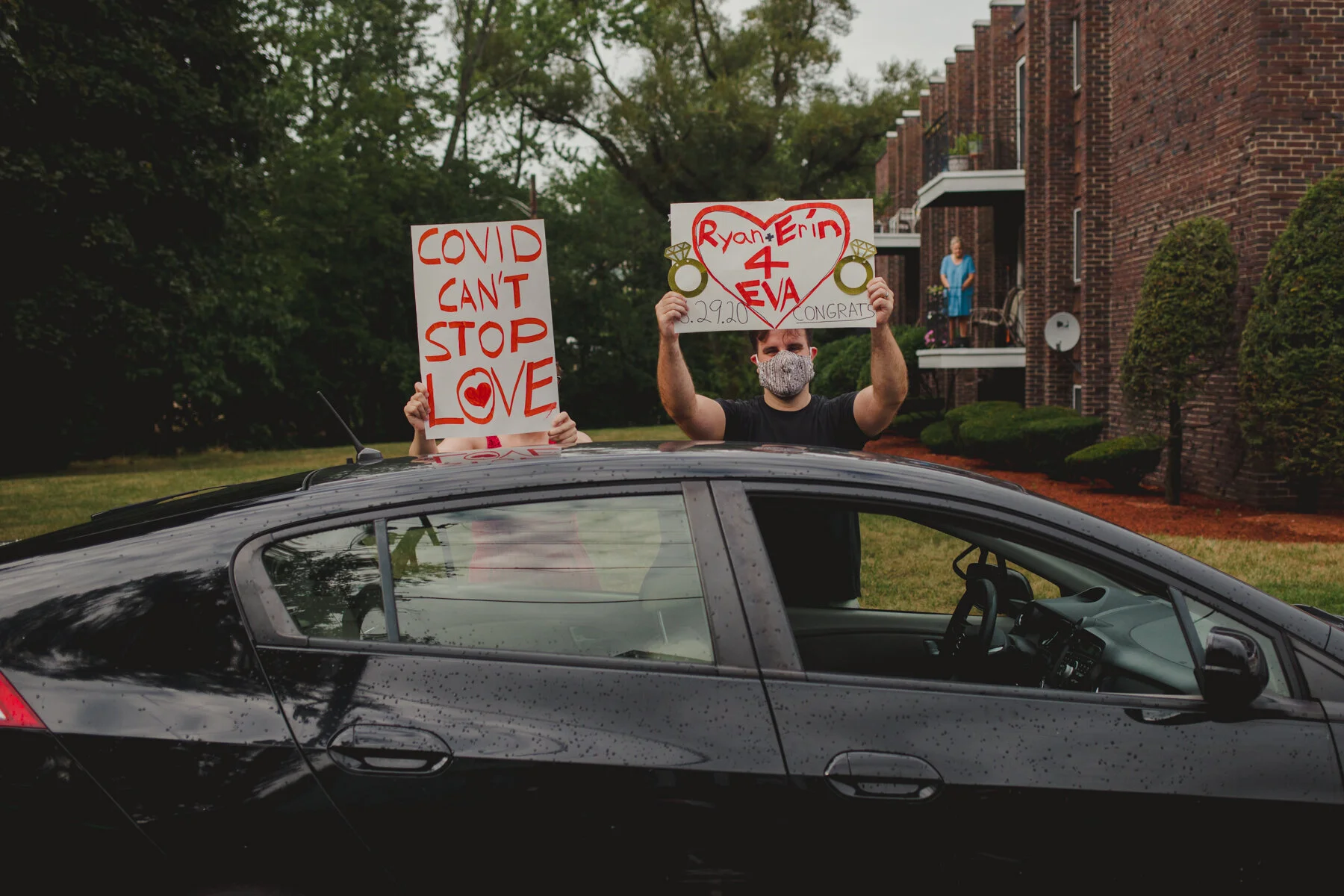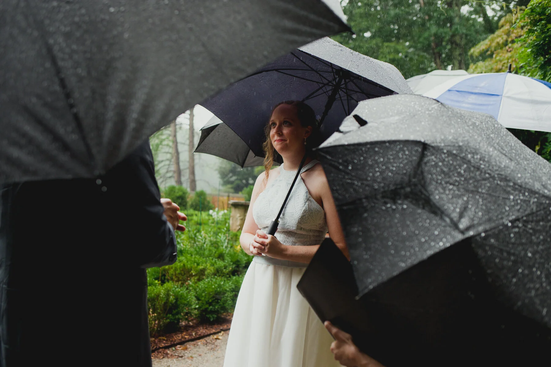 Next, Ryan would talk about the rain. The unrelenting rain, which only picked up more during their ceremony, in a hidden rose garden in the middle of the forest at Maudsley State park, where their families gathered around them, leaning forward to hear the vows spoken amidst the downpour. When Ryan began to read his vows, the rain soaked the papers he had written them on, sending rivulets of ink flowing onto the stonework and the puddles. He had to wing the last few sentences, but Erin already knew his unending devotion and love towards her, no fancy words needed. Finally, they’d tell their grandkids about the great pandemic of 2020, and how it put their original summer camp wedding plans on hold until the next summer, but they still wanted to get married on August 29th. And so, epic falls, Covid 19, and storms be damned, they forged ahead, and what a wonderful day it was! Every family member was present, and so happy to be there. The little kids didn’t whine or complain about the rain- in fact, nobody did at all. The rain cleared up after the ceremony in time for dinner at Ryan’s parents house, and it was an indulgent one, with lobster tails, and steak tips and very good Mac and cheese. A big group of their friends surprised them at the house for a socially-distant parade with signs! And to cap it all off, Erin and Ryan served their families tea in the most beautiful tea ceremony.