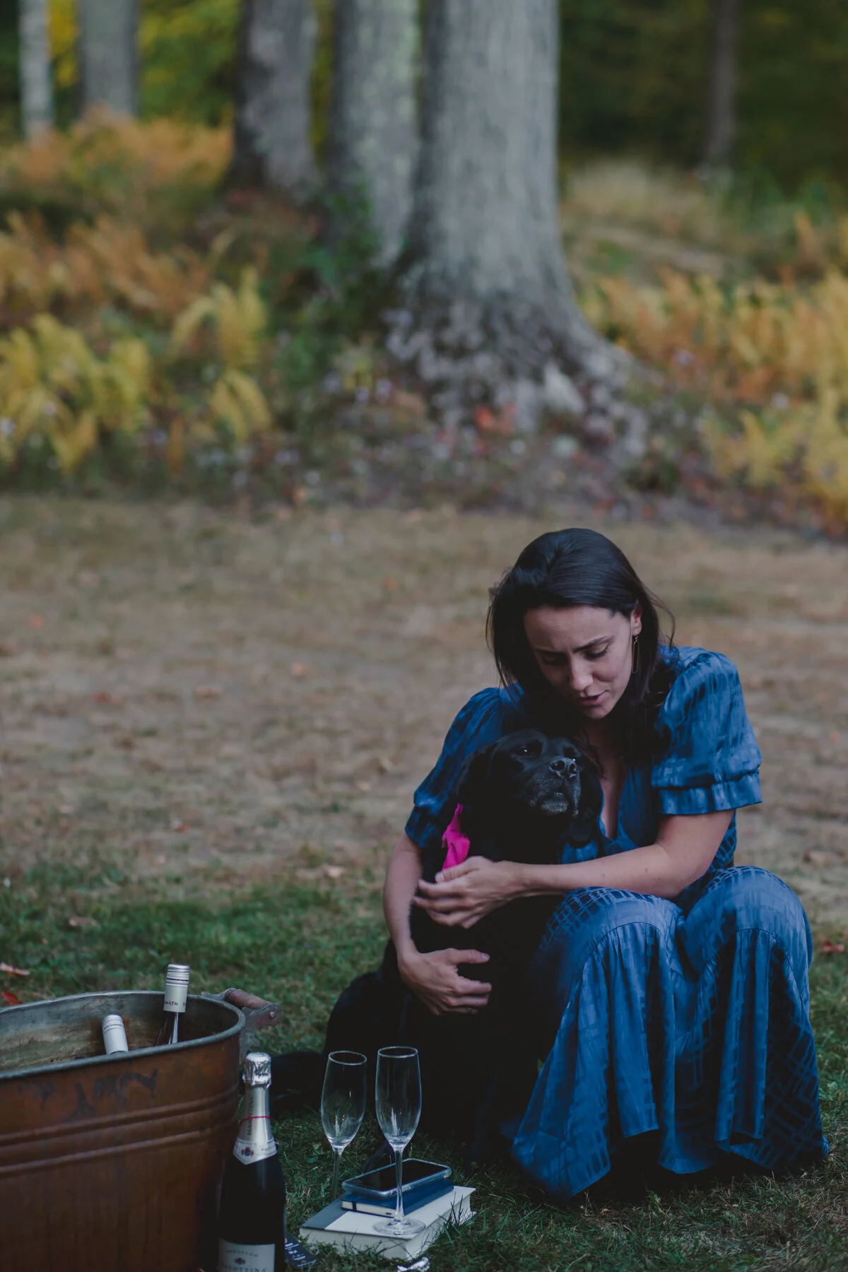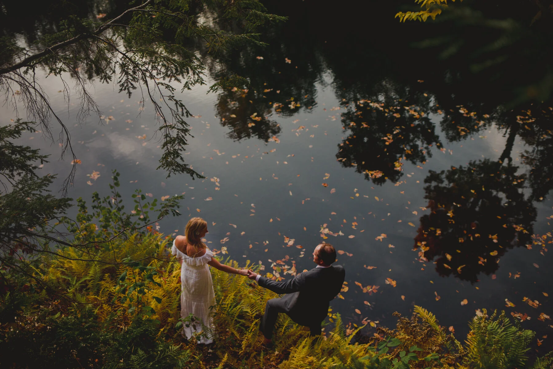 Vermont’s white whale is peak foliage, sunny, and 78 degrees, all at the SAME TIME. Zelie and Rene, the chillest couple in the history of intimate weddings, had the trifecta on Saturday at their awesome Airbnb complete with two ponds, tennis court, slide, and view of the surrounding mountains, probably because they didn’t worry or think about weather much at all. They also had two dogs in attendance and two wedding crashers- Zelie’s dear friends Meg (whose wedding we photographed last September!) and Lily came for a family hike in the morning and decided to stay for the rest of the day, much to Zelie’s delight!